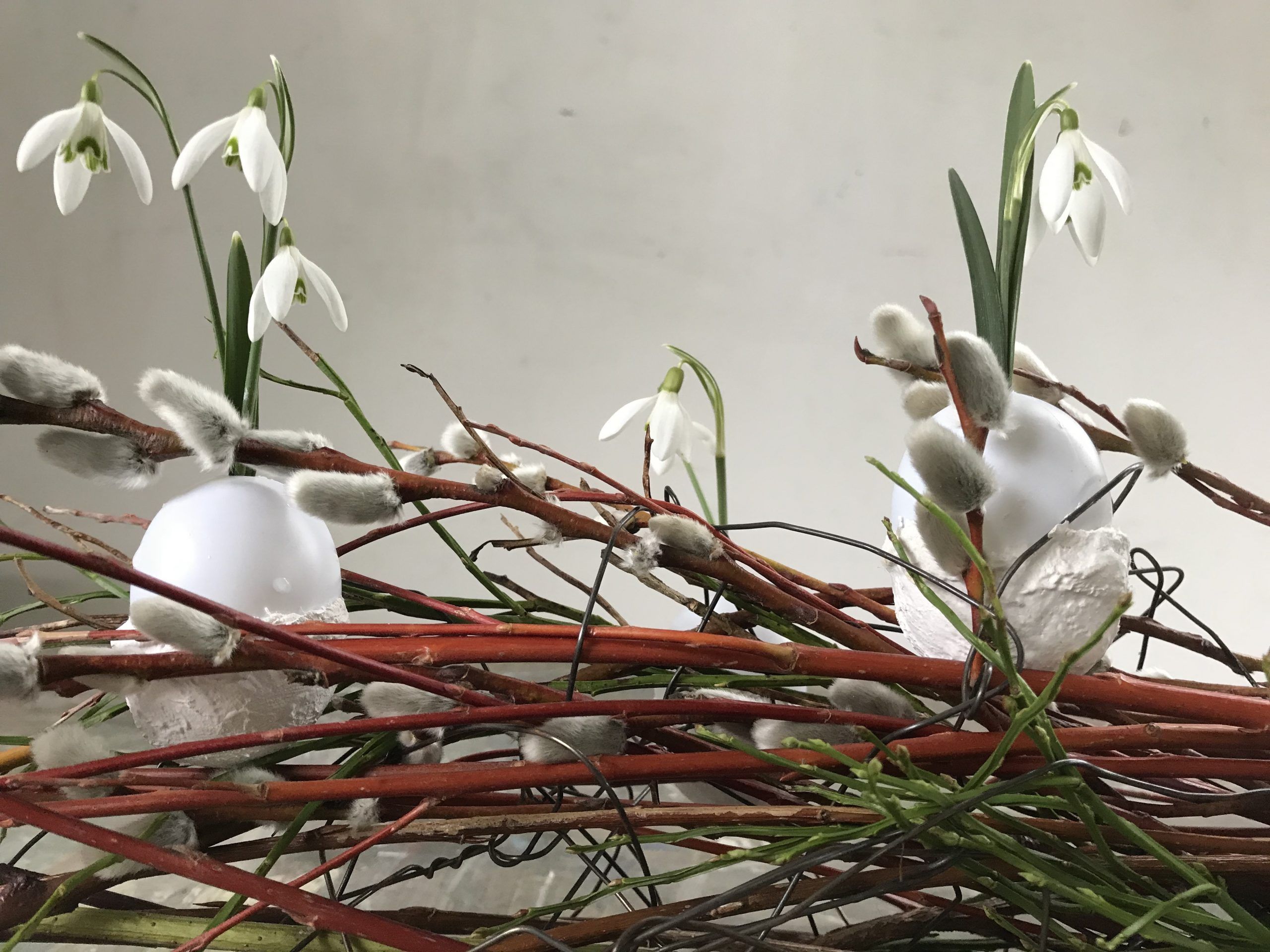 Zur Jahreszeit passend bestückt mit Kätzchen, Glöckchen, Gras und Ei holt es den Frühling und die Osterzeit ins Haus.