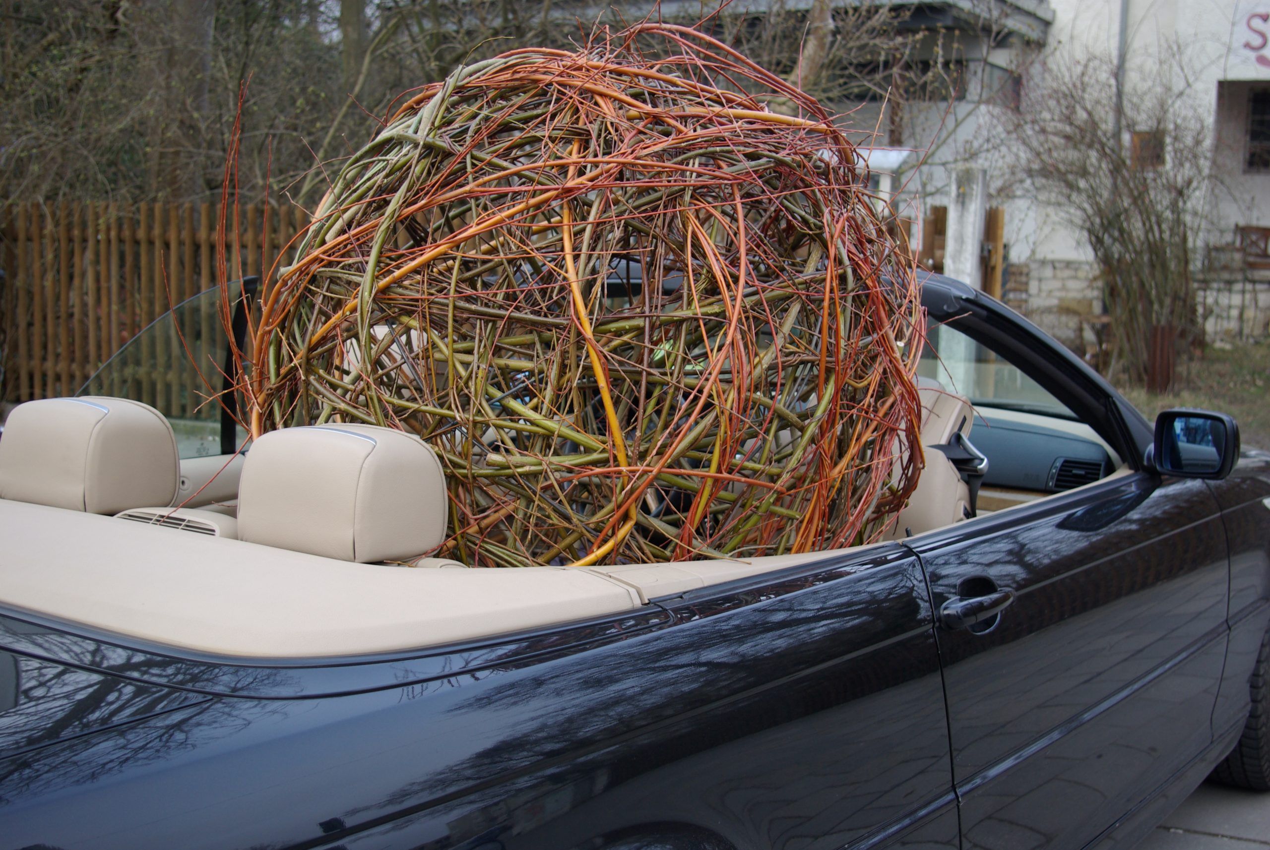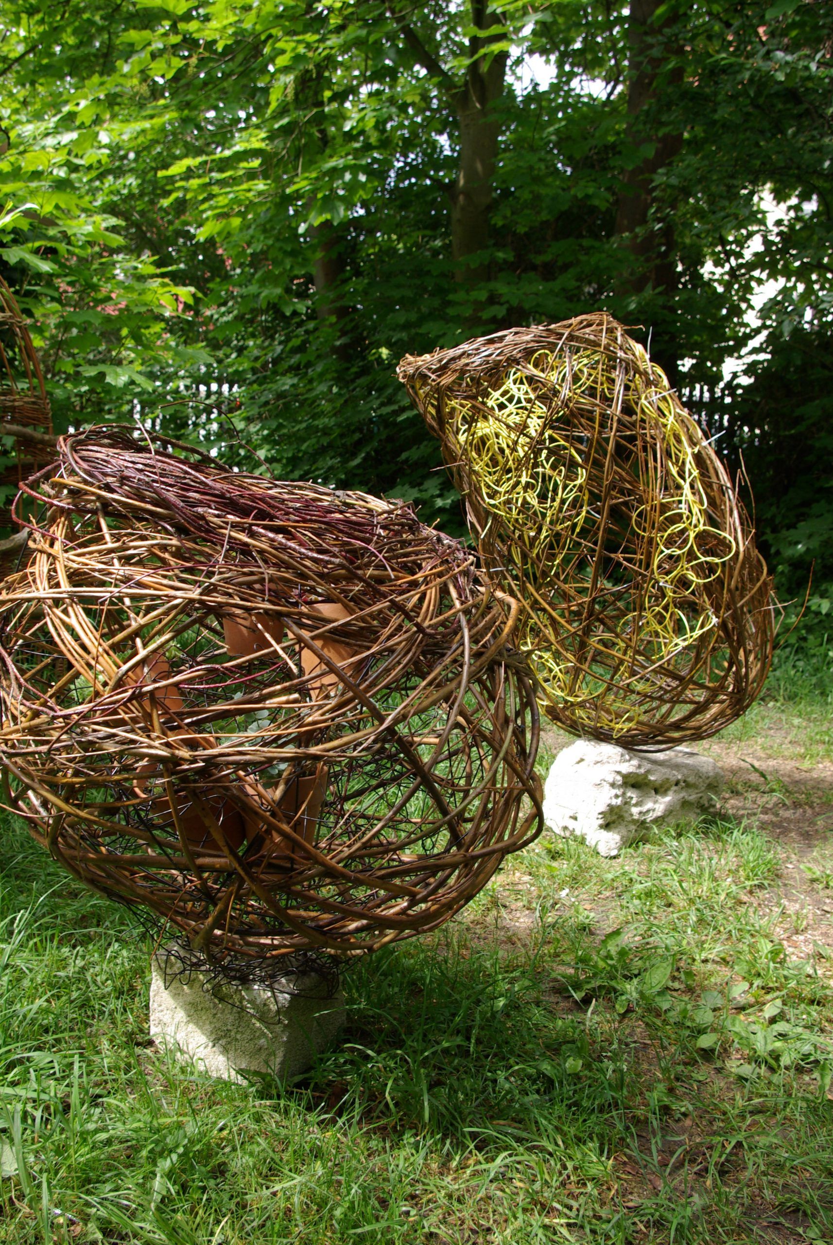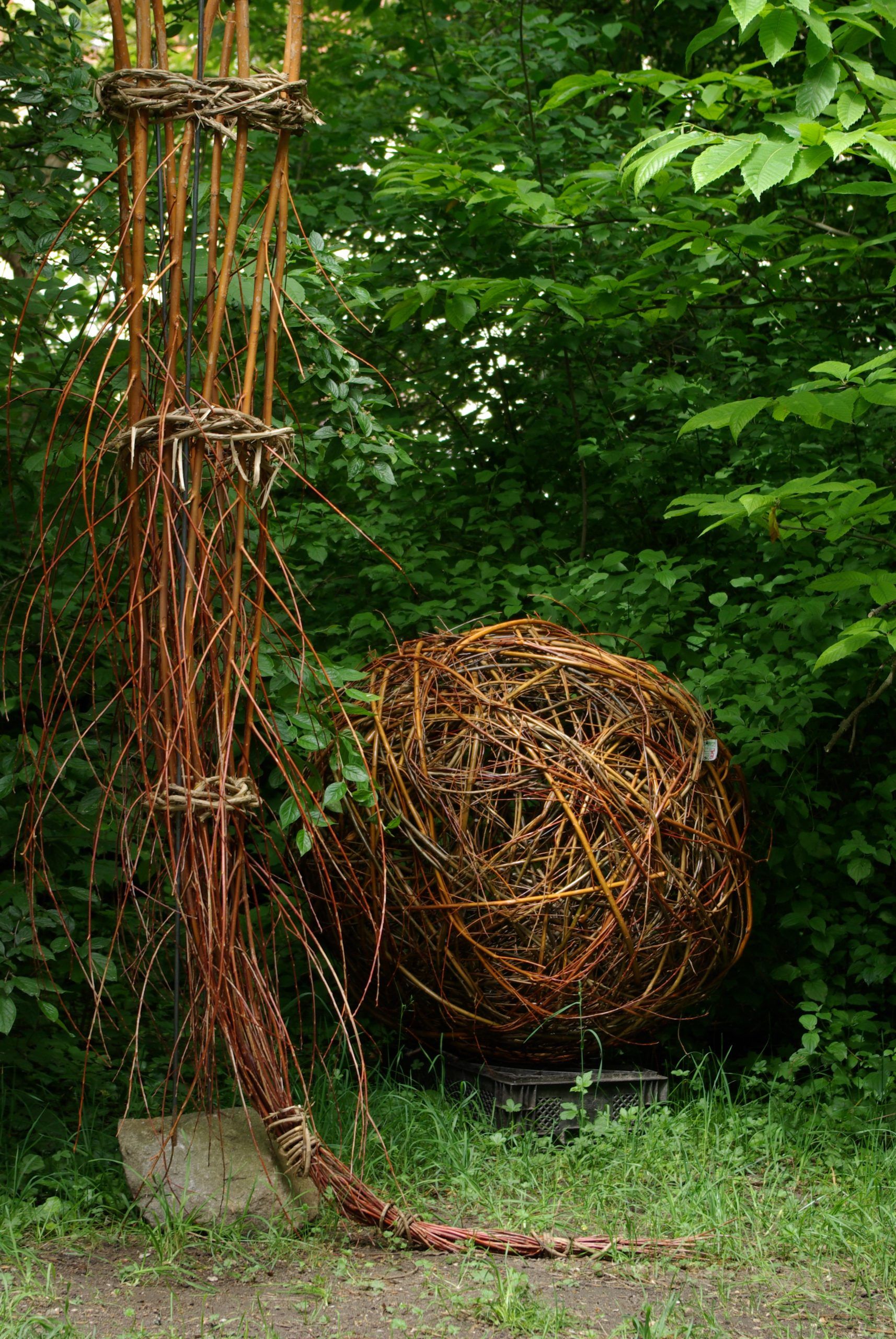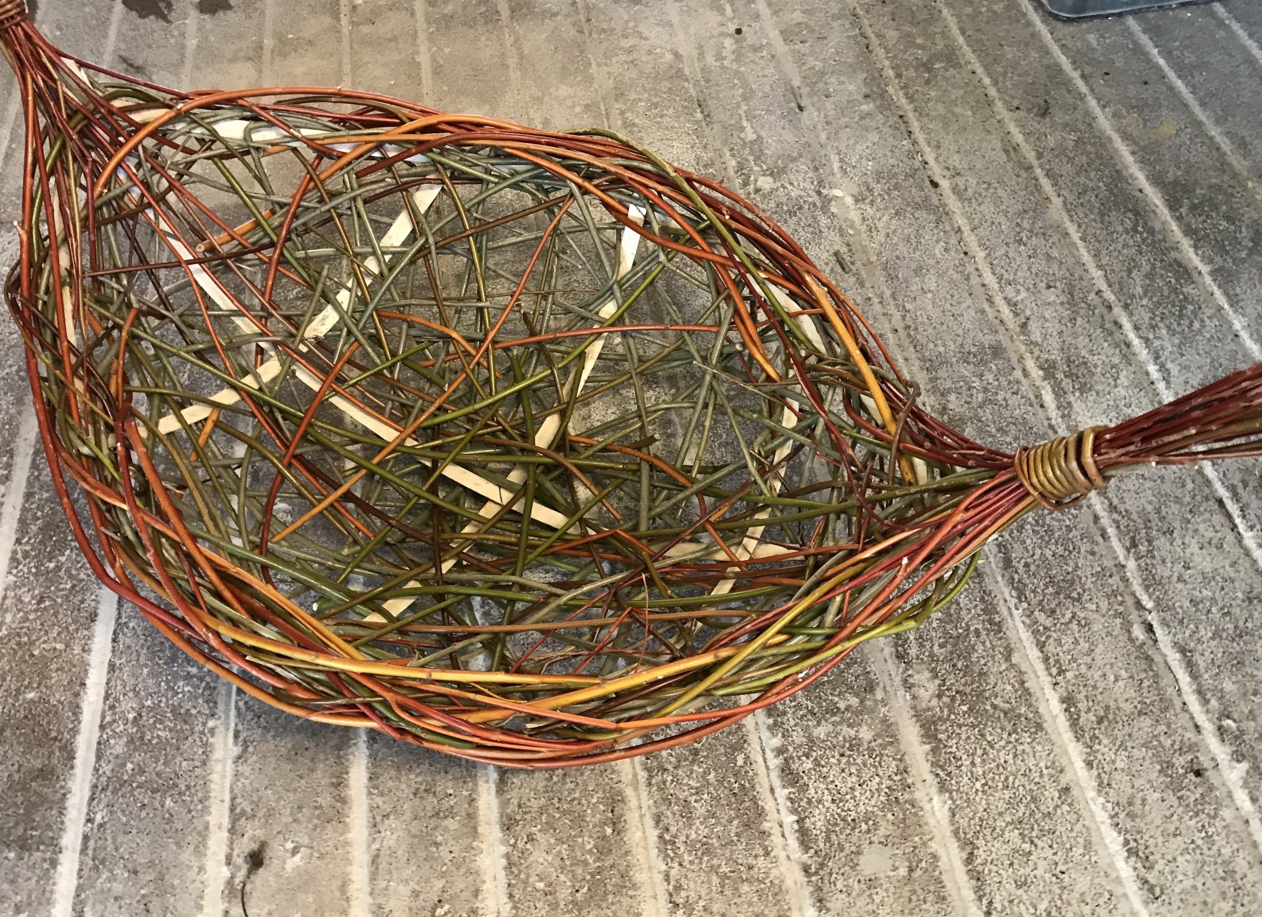 An der individuellen Drahtform kann das Flechten mit frischer Weide beginnen. Im sogenannten Chaosgeflecht wird nach einer bestimmten Reihenfolge gearbeitet. Ein Rhythmus stellt sich ein, der das Werk voranbringt.