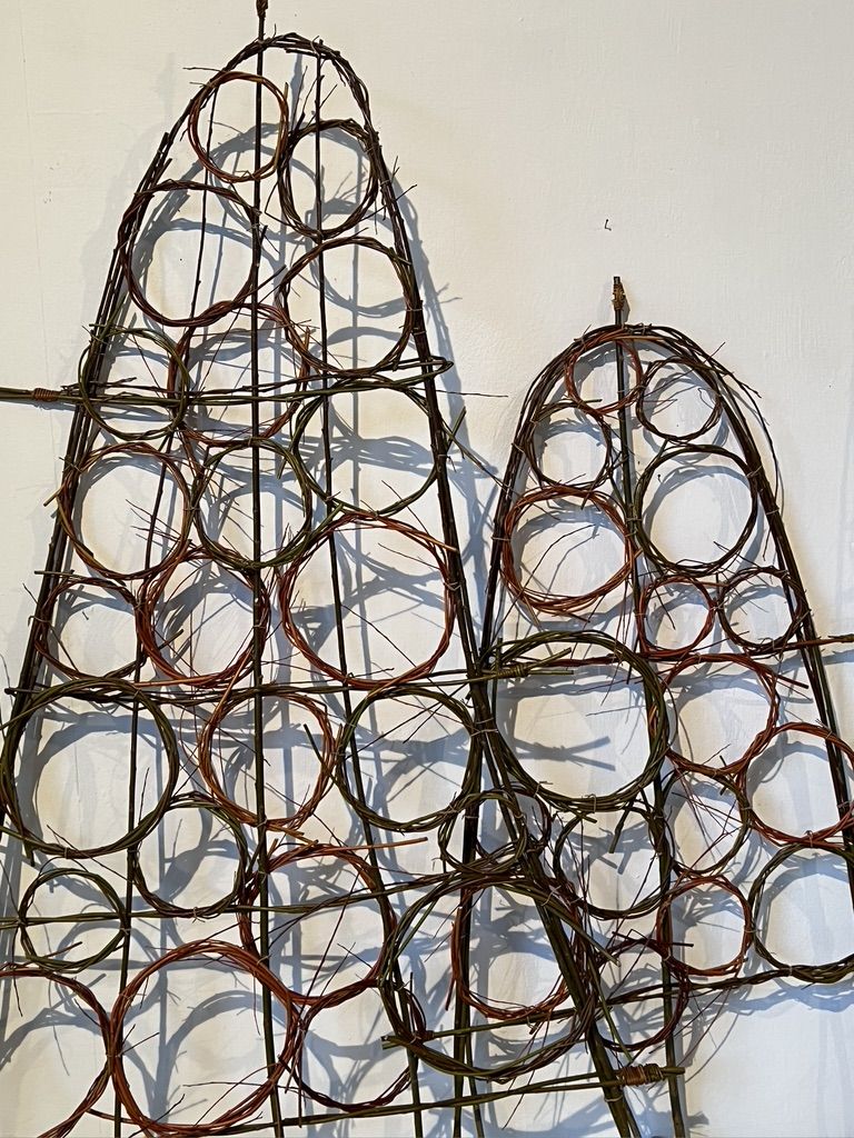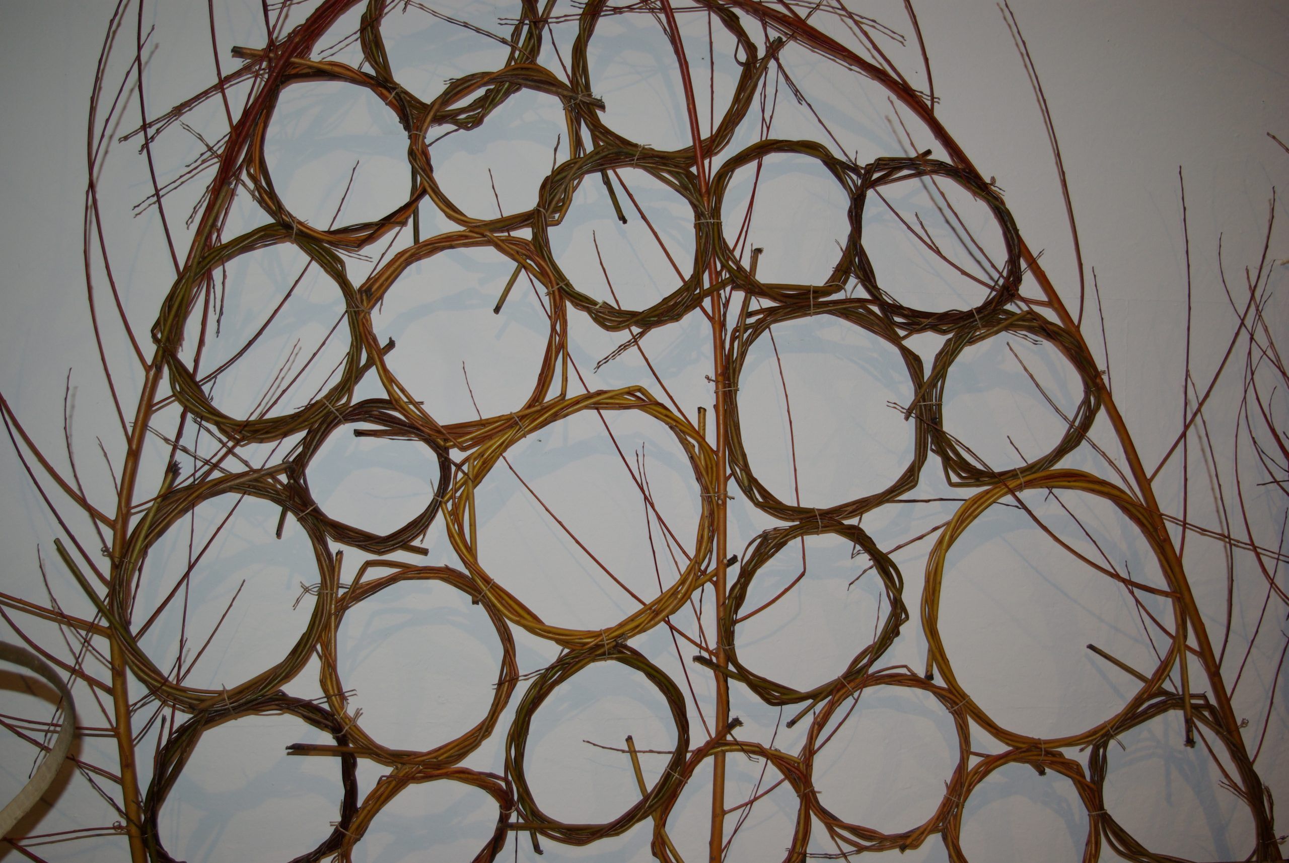 Viele Weidenringe in unterschiedlichen Größen winden und wie ein Puzzlespiel aneinanderlegen. Ein Rahmen in individueller Form und Größe hält die Reifenvielfalt zusammen. Was einfach aussieht, braucht doch Struktur und Technik. Winden und Fitzen sind die beiden Techniken, um eine stabile Form aufzubauen.