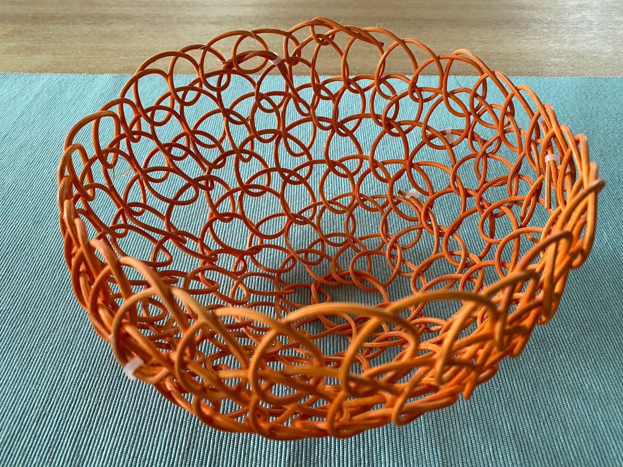 Bunte Weidenruten durch ein starkes Rippengerüst weben und im Nu verdichtet sich der Boden. Eine dicke Wulst zum Abschluss, fertig ist das Pflanzgefäß in Schiffschaukelform.