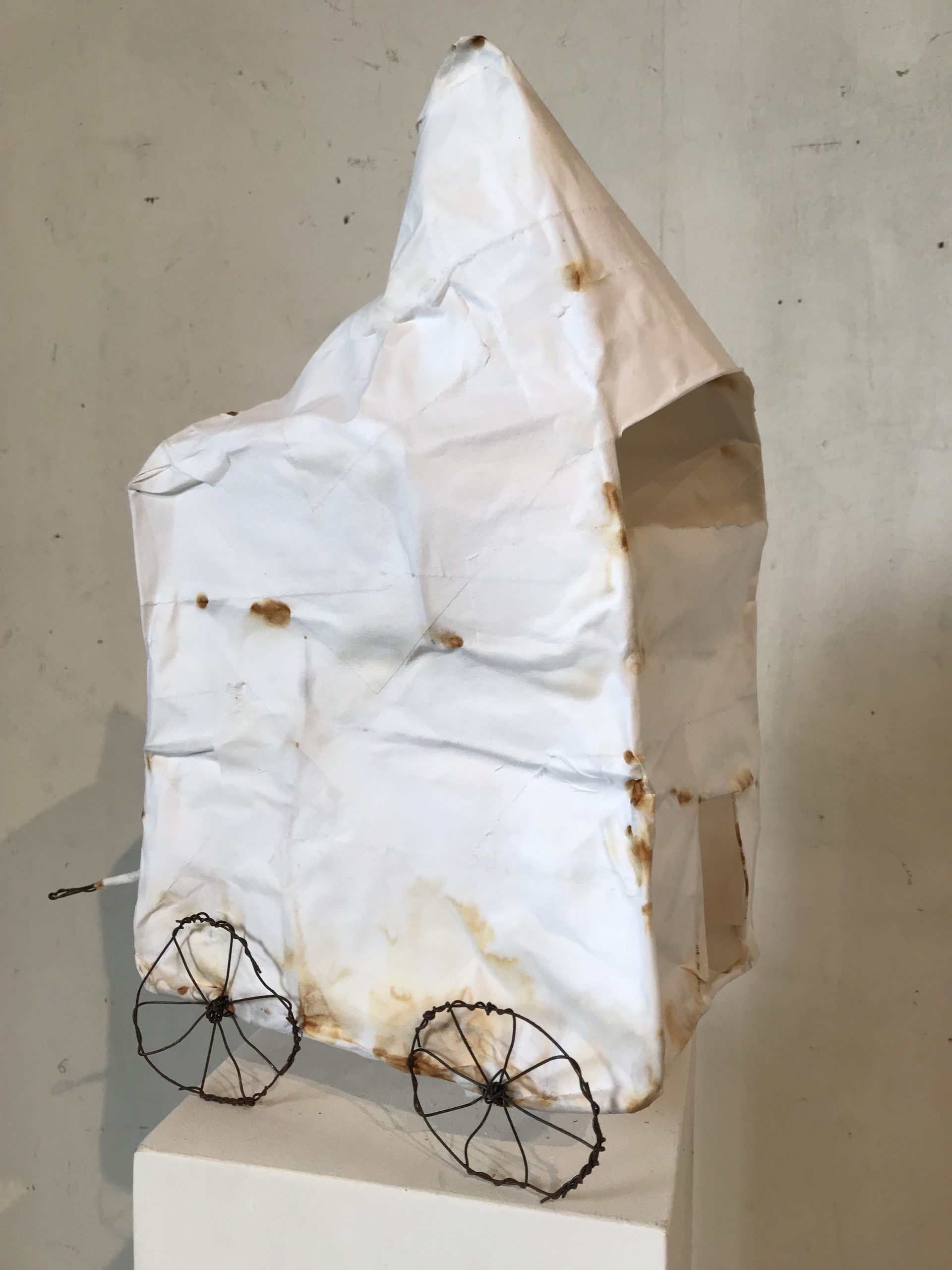 Die kleinen Drahtskulpturen können mit Papier bezogen werden, oder auch mit Seiten aus alten Büchern, als Träger von Text und Bild.